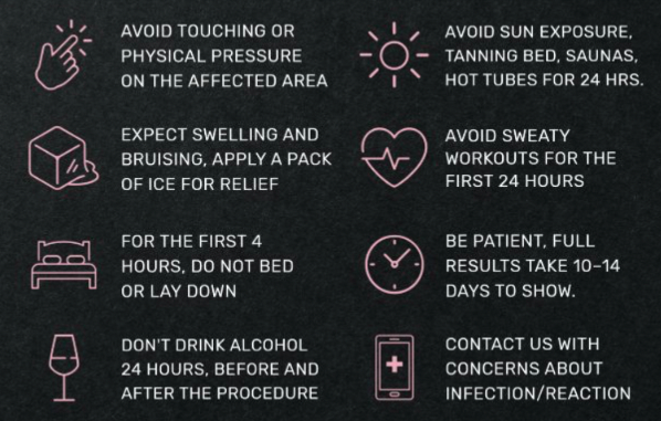 These treatment work by preventing the nerve signals that cause facial muscle contractions thereby relaxing the facial muscles that cause fine lines and wrinkles. Neurotoxin treatments are quick 10-minute treatments with minimal downtime and minimal side effects. Common side effects include temporary discomfort at injection sites. Desired results may be noticed as early as within in 48 hours and may last 3-6 months.